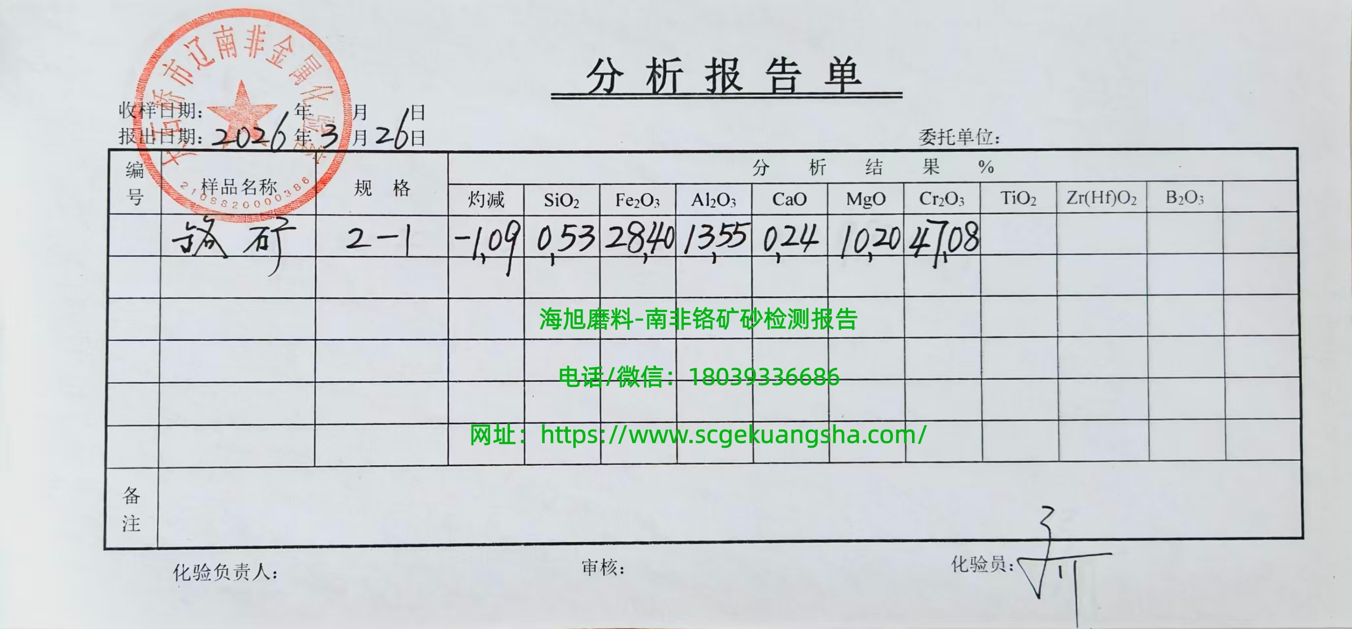 铬矿砂的化学成分检测报告